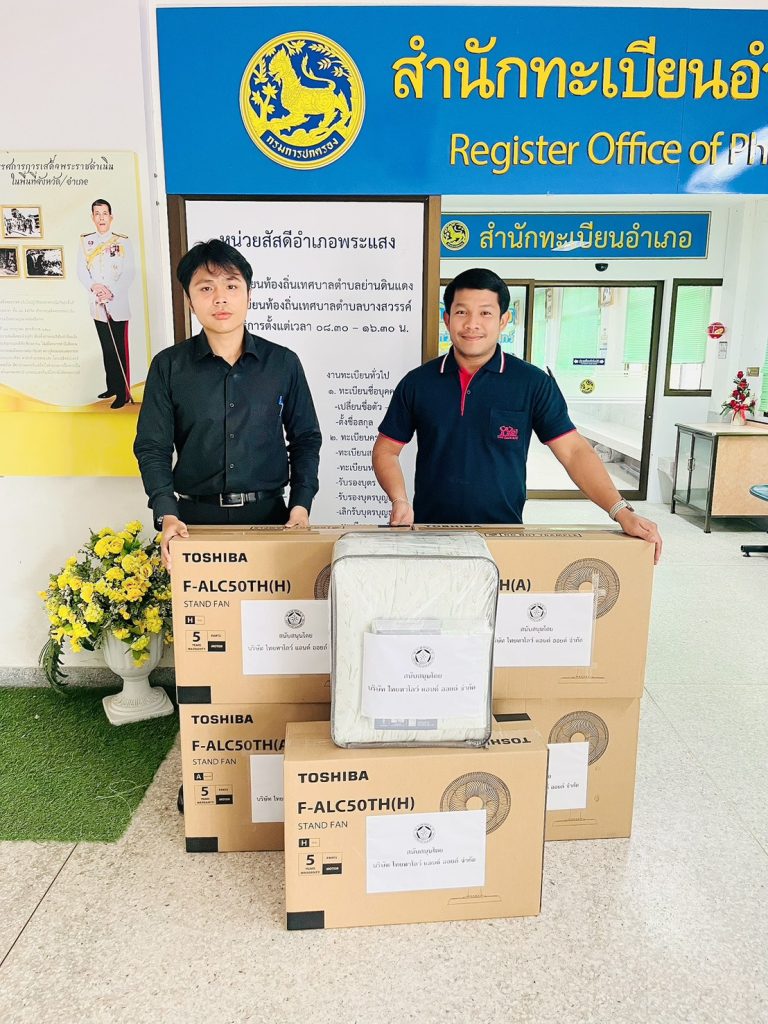 ม.ค. 31, 2026MOON ตัวแทนบริษัท มอบของขวัญ-ของรางวัลในการออกร้านนาวากาชาดจังหวัดสุราษฎร์ธานีประจำปี 2569 ให้กับที่ว่าการอำเภอพระแสง ในงาน “สมโภชศาลหลักเมืองและกาชาดสุราษฎร์ธานี ประจำปี 2569” โดยมอบพัดลมโตชิบาจำนวน 5 ตัว ผ้าห่มนวม 1 ชุด